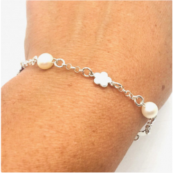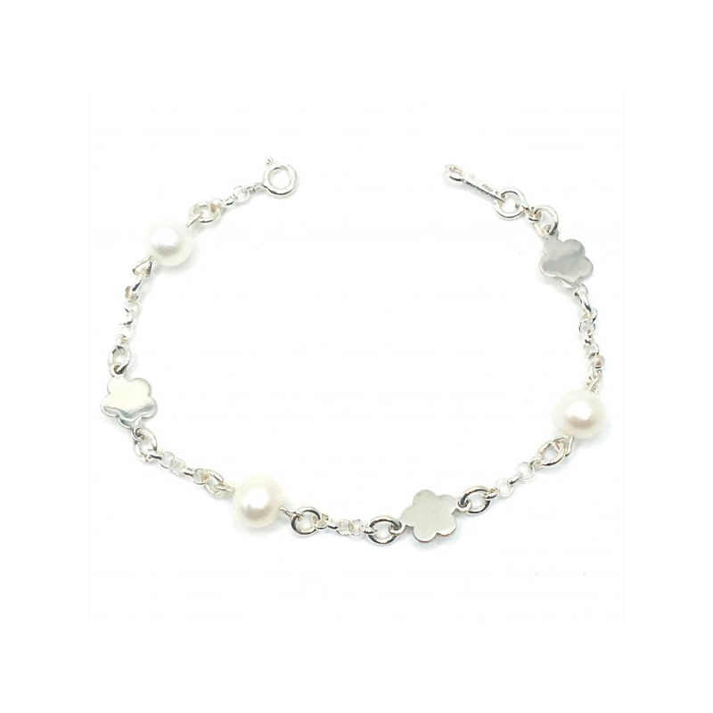 PULSERA COMUNIÓN DE FLORES CON PERLAS FABRICADA EN PLATA DE PRIMERA LEY 925MLS POR NUESTROS MAESTROS ARTESANOS EN ESPAÑA.